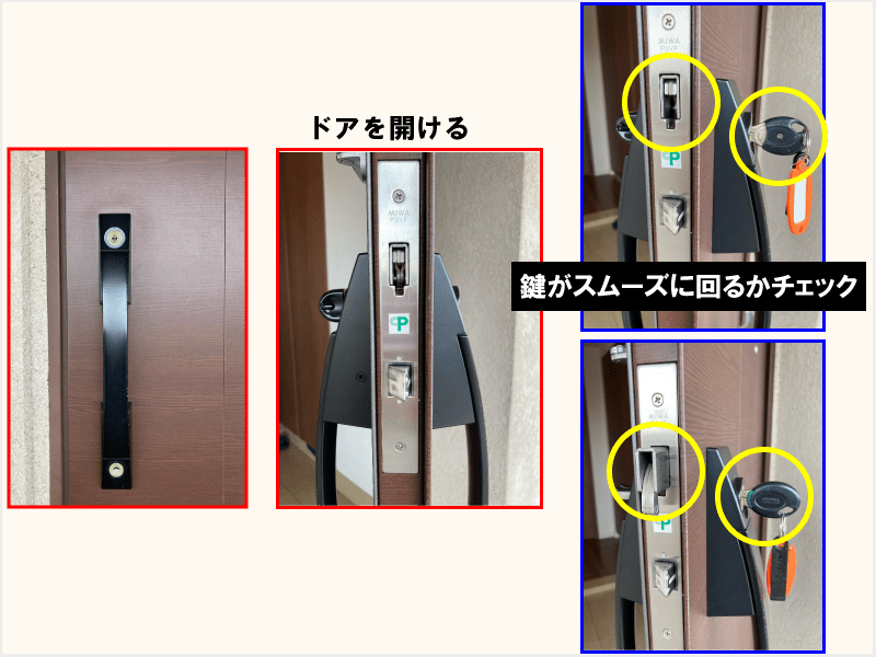 2つ目 ドアを開放した状態で、鍵がスムーズに回るか確認。回る場合は鍵穴に異常なし、回らない場合は鍵穴と内側のツマミ(サムターン)両方とも回らない、回りずらい場合はドアの中にある錠前の交換が必要です。外側の鍵穴だけ、内側のツマミ(サムターン)だけの場合は各所の交換でOKです。